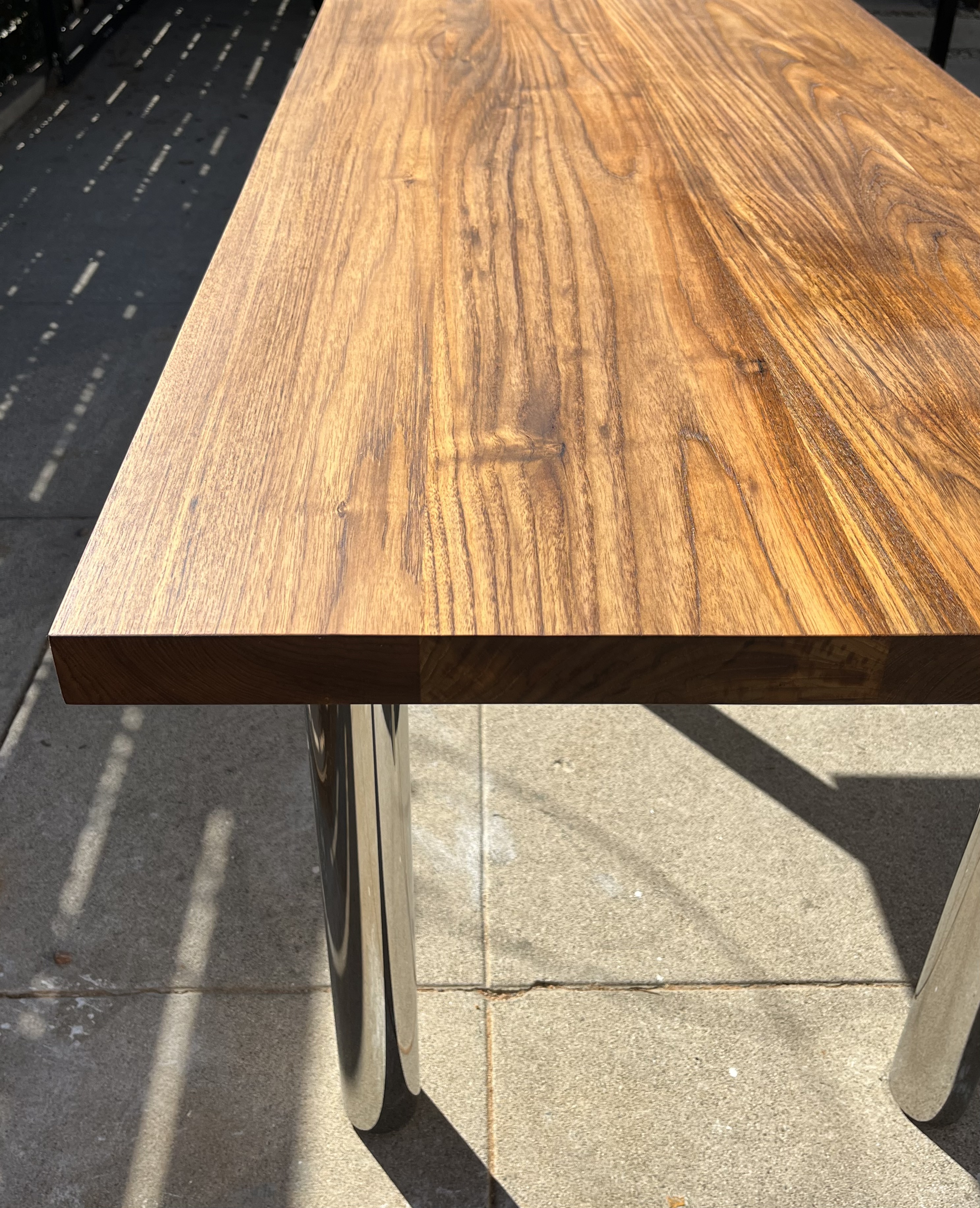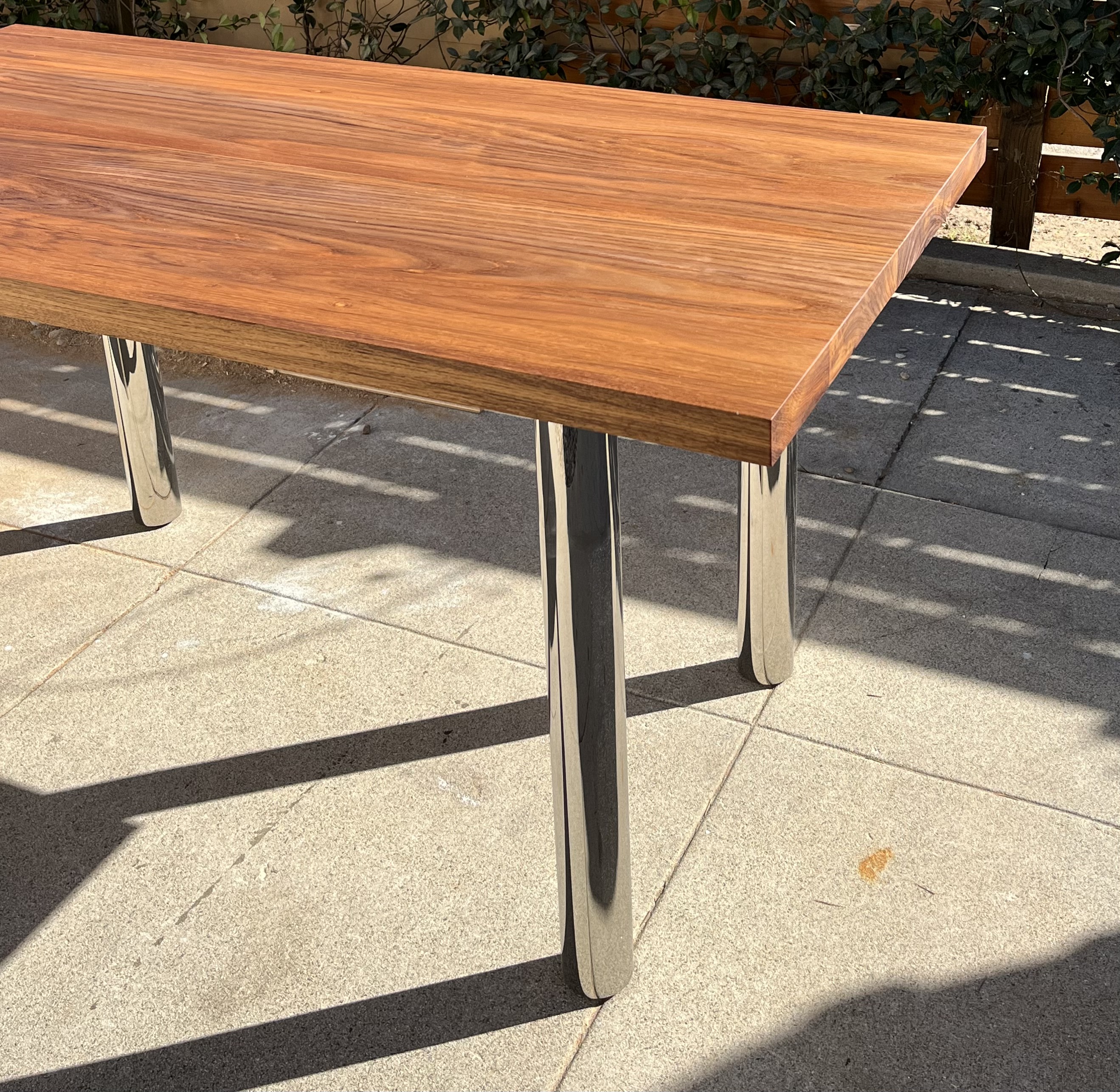 This commissioned table was directly inspired by architect Mies van der Rohe, and the furniture he designed for the Farnsworth House. The top surface is made from laminated boards of solid 8/4 teak, and the legs out of chrome plated steel tubing. A steel substructure, as well as the mounting plates for the legs, are recessed into the underside of the table.